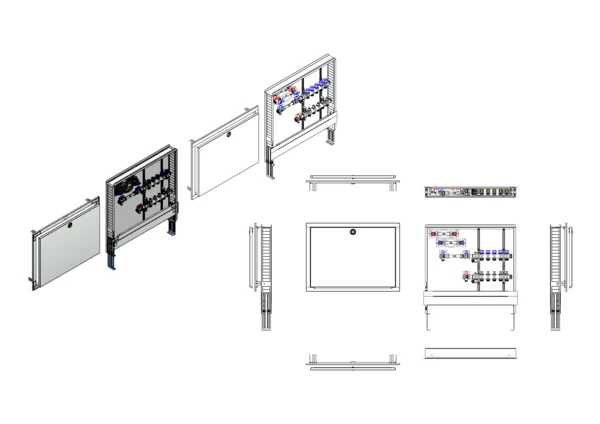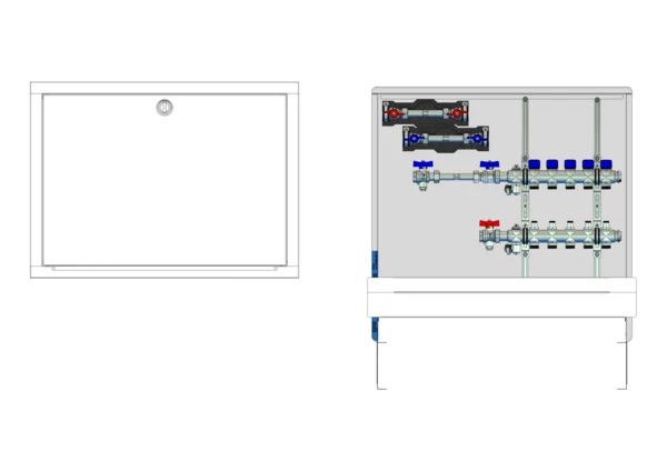Die Anschlussstation für Flächenheizung und -kühlung ist im Unterputzschrank montiert und umfasst einen Edelstahlverteiler mit integrierten Regulierventilen und Ventileinsätzen (M30x1,5), sowie eine horizontale Anschlussgarnitur mit Wärmezählerverrohrung. Zusätzlich sind Wasserzählereinbaustrecken für Trinkwasser kalt und warm vorhanden. Es gibt Platzhaltungen für Stellantriebe.