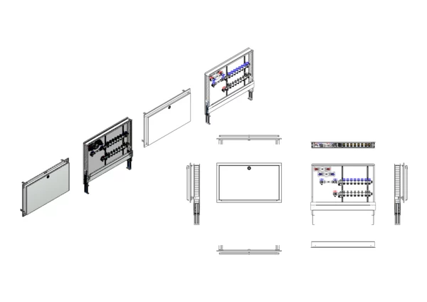 Die Anschlussstation für Flächenheizung und -kühlung ist im Unterputzschrank montiert und umfasst einen Edelstahlverteiler mit integrierten Regulierventilen und Ventileinsätzen (M30x1,5), sowie eine horizontale Anschlussgarnitur mit Wärmezählerverrohrung. Zusätzlich sind Wasserzählereinbaustrecken für Trinkwasser kalt und warm vorhanden. Es gibt Platzhaltungen für Stellantriebe.