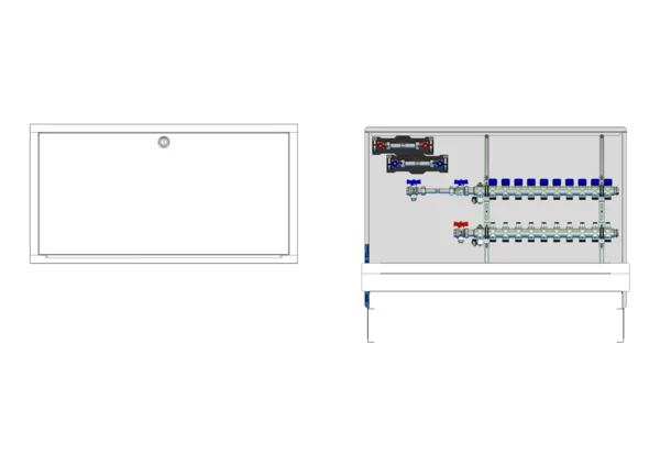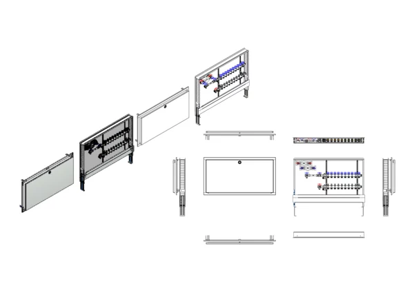Die Anschlussstation für Flächenheizung und -kühlung ist im Unterputzschrank montiert und umfasst einen Edelstahlverteiler mit integrierten Regulierventilen und Ventileinsätzen (M30x1,5), sowie eine horizontale Anschlussgarnitur mit Wärmezählerverrohrung. Zusätzlich sind Wasserzählereinbaustrecken für Trinkwasser kalt und warm vorhanden. Es gibt Platzhaltungen für Stellantriebe.