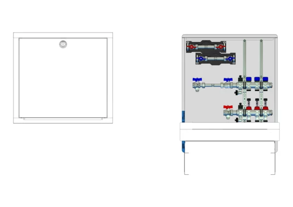 Die Anschlussstation für Flächenheizung und -kühlung ist im Unterputzschrank montiert und umfasst einen Edelstahlverteiler mit regulierbaren Durchflussanzeigern und Ventileinsätzen (M30x1,5), sowie eine horizontale Anschlussgarnitur mit Wärmezählerverrohrung. Zusätzlich sind Wasserzählereinbaustrecken für Trinkwasser kalt und warm vorhanden. Es gibt Platzhaltungen für Stellantriebe.