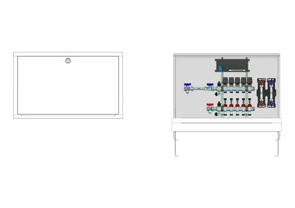 horizontale Anschlussgarnitur mit Wärmezählerverohrung, Verteiler mit Durchflussanzeiger 0-3 l/min im Vorlaufbalken und Thermostatventileinsatz M30x1,5 im Rücklaufbalken, mit vormontierten Stellantrieben und Klemmleiste mit Vorverdrahtung, Wasserzählerstrecken Trinkwasser kalt und warm, Standard-Schrank mit Frontblende in RAL 9016