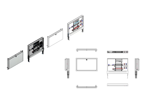 horizontale Anschlussgarnitur mit Wärmezählerverohrung, Verteiler mit Durchflussanzeiger 0-3 l/min im Vorlaufbalken und Thermostatventileinsatz M30x1,5 im Rücklaufbalken, mit vormontierten Stellantrieben und Klemmleiste mit Vorverdrahtung, Wasserzählerstrecken Trinkwasser kalt und warm, Standard-Schrank mit Frontblende in RAL 9016