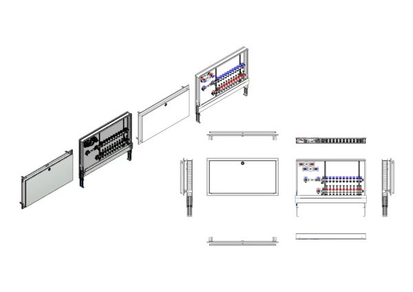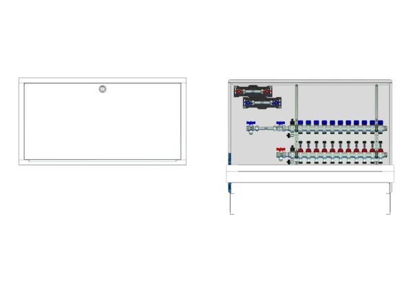 horizontale Anschlussgarnitur mit Wärmezählerverohrung, Verteiler mit Durchflussanzeiger 0-3 l/min im Vorlaufbalken und Thermostatventileinsatz M30x1,5 im Rücklaufbalken, Wasserzählerstrecken Trinkwasser kalt und warm, Standard-Unterputz-Schrank mit Frontblende in RAL 9016