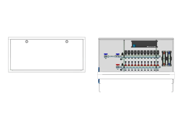 horizontale Anschlussgarnitur mit Wärmezählerverohrung, Verteiler mit Durchflussanzeiger 0-3 l/min im Vorlaufbalken und Thermostatventileinsatz M30x1,5 im Rücklaufbalken, mit vormontierten Stellantrieben und Klemmleiste mit Vorverdrahtung, Wasserzählerstrecken Trinkwasser kalt und warm, Standard-Schrank mit Frontblende in RAL 9016