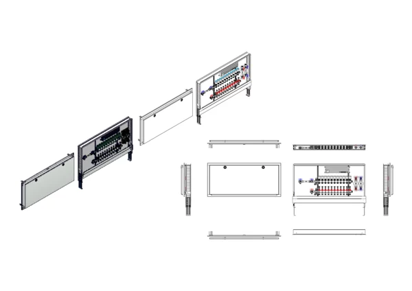 Die Anschlussstation für Flächenheizung ist im Unterputzschrank montiert und umfasst einen Edelstahlverteiler mit regulierbaren Durchflussanzeigern und Ventileinsätzen (M30x1,5), sowie eine horizontale Anschlussgarnitur mit Wärmezählerverrohrung. Zusätzlich sind Wasserzählereinbaustrecken für Trinkwasser kalt und warm vorhanden. Die vormontierten und verdrahteten Stellantriebe sind auf einer montierten Klemmleiste installiert.