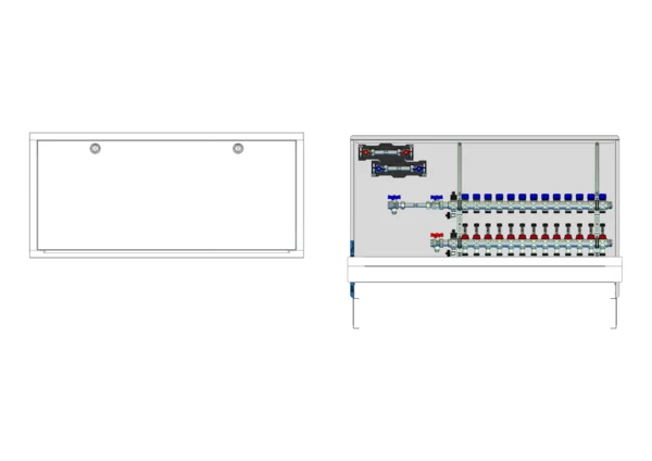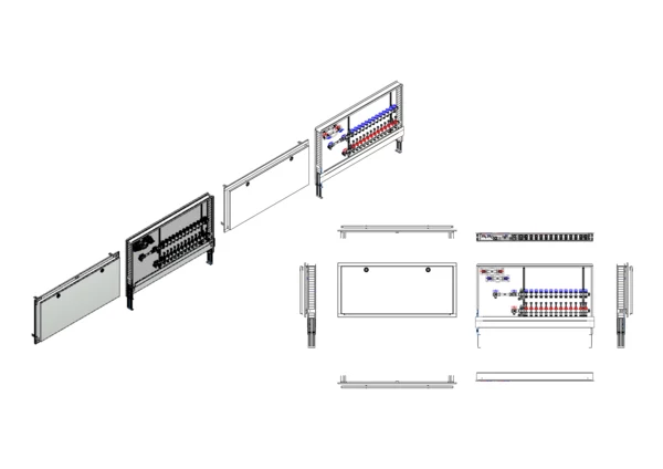 Die Anschlussstation für Flächenheizung und -kühlung ist im Unterputzschrank montiert und umfasst einen Edelstahlverteiler mit regulierbaren Durchflussanzeigern und Ventileinsätzen (M30x1,5), sowie eine horizontale Anschlussgarnitur mit Wärmezählerverrohrung. Zusätzlich sind Wasserzählereinbaustrecken für Trinkwasser kalt und warm vorhanden. Es gibt Platzhaltungen für Stellantriebe.