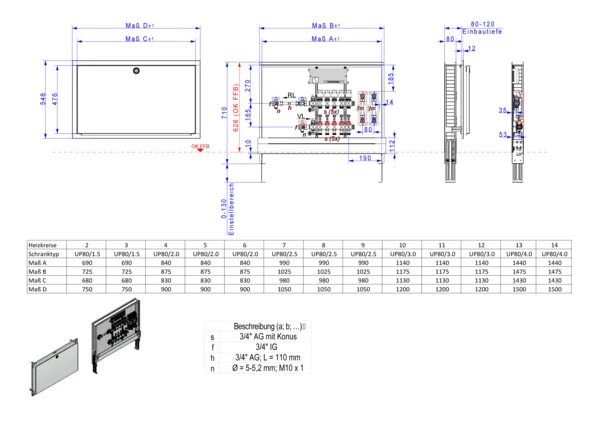 horizontale Anschlussgarnitur mit Wärmezählerverohrung, Verteiler mit Durchflussanzeiger 0-3 l/min im Vorlaufbalken und Thermostatventileinsatz M30x1,5 im Rücklaufbalken, mit vormontierten Stellantrieben und Klemmleiste mit Vorverdrahtung, Wasserzählerstrecken Trinkwasser kalt und warm, Standard-Schrank mit Frontblende in RAL 9016