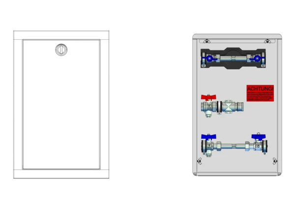 Die Wohnungsanschlussstation ist mit einer Wärmezählervorbereitung und Wasserzählerverrohrung für Trinkwasser kalt, sowie einem horizontalen Primär- und Sekundäranschluss im Wand-Unterputzschrank ausgestattet.
