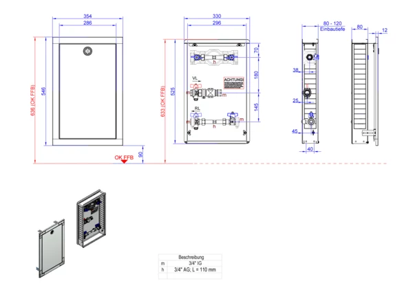Die Anschlussstation ist für Wohnungsanschlüsse geeignet. Sie dient zum Absperren und zur Wärmezählung des Wohnungsstranges. Im Standard-Wandschrank mit Frontblende in weiß RAL 9016 mit einer Einbautiefe von 80 bis 120 mm ist eine Edelstahlverrohrung mit einer horizontalen Anschlussgarnitur mit Wärmezählervorbereitung 3/4" Länge 110 mm und Fühleranschluss 5-5,2 M10x1 im Vor- und Rücklaufkugelhahn ist schallentkoppelt montiert. In der Anschlussstation ist zusätzlich eine Wasserzählervorbereitung 3/4" AG Länge 110 mm mit Absperrungen für kaltes Trinkwasser montiert.