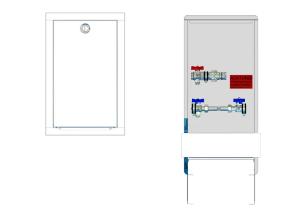 Die Wohnungsanschlussstation ist mit einer Wärmezählervorbereitung, sowie einem horizontalen Primär- und Sekundäranschluss im Unterputzschrank ausgestattet.