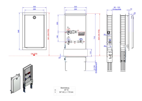 Die Anschlussstation ist für Wohnungsanschlüsse geeignet. Sie dient zum Absperren und zur Wärmezählung des Wohnungsstranges. Im Standard-Unterputzschrank mit Frontblende in weiß RAL 9016 mit einer Einbautiefe von 80 bis 120 mm ist eine Edelstahlverrohrung mit einer horizontalen Anschlussgarnitur mit Wärmezählervorbereitung 3/4" Länge 110 mm und Fühleranschluss 5-5,2 M10x1 im Vor- und Rücklaufkugelhahn ist schallentkoppelt montiert.