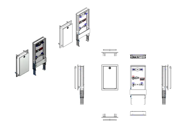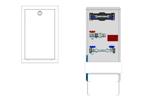 Die Wohnungsanschlussstation ist mit einer Wärmezählervorbereitung und Wasserzählerverrohrung für Trinkwasser kalt, sowie einem horizontalen Primär- und Sekundäranschluss im Unterputzschrank ausgestattet.