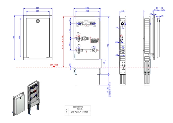 Die Anschlussstation ist für Wohnungsanschlüsse geeignet. Sie dient zum Absperren und zur Wärmezählung des Wohnungsstranges. Im Standard-Unterputzschrank mit Frontblende in weiß RAL 9016 mit einer Einbautiefe von 80 bis 120 mm ist eine Edelstahlverrohrung mit einer horizontalen Anschlussgarnitur mit Wärmezählervorbereitung 3/4" Länge 110 mm und Fühleranschluss 5-5,2 M10x1 im Vor- und Rücklaufkugelhahn ist schallentkoppelt montiert. In der Anschlussstation ist zusätzlich eine Wasserzählervorbereitung 3/4" AG Länge 110 mm mit Absperrungen für kaltes Trinkwasser montiert.