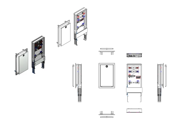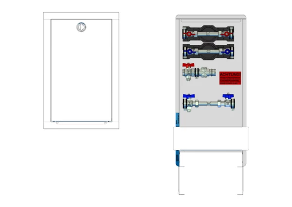 Die Wohnungsanschlussstation ist mit einer Wärmezählervorbereitung und Wasserzählerverrohrungen für Trinkwasser kalt und warm, sowie einem horizontalen Primär- und Sekundäranschluss im Unterputzschrank ausgestattet.