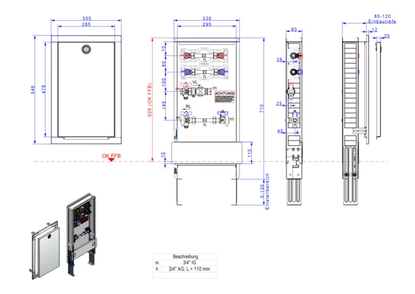 Die Anschlussstation ist für Wohnungsanschlüsse geeignet. Sie dient zum Absperren und zur Wärmezählung des Wohnungsstranges. Im Standard-Unterputzschrank mit Frontblende in weiß RAL 9016 mit einer Einbautiefe von 80 bis 120 mm ist eine Edelstahlverrohrung mit einer horizontalen Anschlussgarnitur mit Wärmezählervorbereitung 3/4" Länge 110 mm und Fühleranschluss 5-5,2 M10x1 im Vor- und Rücklaufkugelhahn ist schallentkoppelt montiert. In der Anschlussstation ist zusätzlich eine Wasserzählervorbereitung 3/4" AG Länge 110 mm mit Absperrungen für kaltes und warmes Trinkwasser montiert.