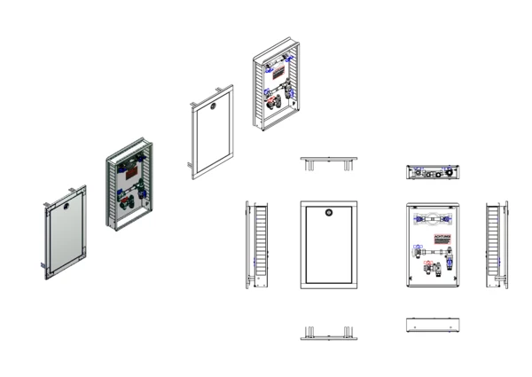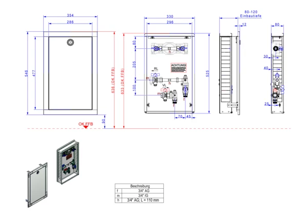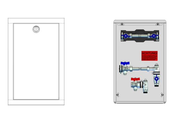 Die Anschlussstation ist für Wohnungsanschlüsse geeignet. Sie dient zum Absperren und zur Wärmezählung des Wohnungsstranges. Im Standard-Wandschrank mit Frontblende in weiß RAL 9016 mit einer Einbautiefe von 80 bis 120 mm ist eine Edelstahlverrohrung mit einer horizontalen Anschlussgarnitur mit Wärmezählervorbereitung 3/4" Länge 110 mm und Fühleranschluss 5-5,2 M10x1 im Vor- und Rücklaufkugelhahn ist schallentkoppelt montiert. Die Sekundärabgänge sind vertikal ausgerichtet. In der Anschlussstation ist zusätzlich eine Wasserzählervorbereitung 3/4" AG Länge 110 mm mit Absperrungen für kaltes Trinkwasser montiert.