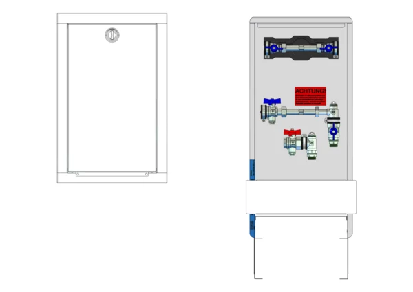 Die Wohnungsanschlussstation ist mit einer Wärmezählervorbereitung und Wasserzählerverrohrung für Trinkwasser kalt , sowie einem horizontalen Primäranschluss im Unterputzschrank ausgestattet.