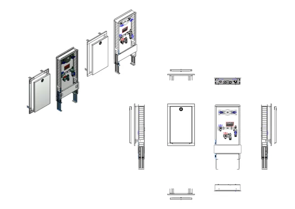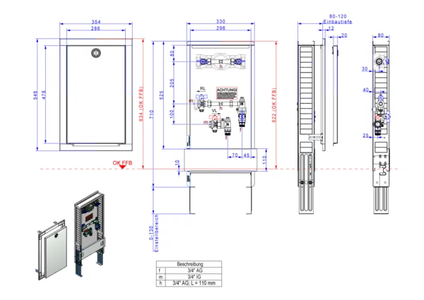 Die Anschlussstation ist für Wohnungsanschlüsse geeignet. Sie dient zum Absperren und zur Wärmezählung des Wohnungsstranges. Im Standard-Unterputzschrank mit Frontblende in weiß RAL 9016 mit einer Einbautiefe von 80 bis 120 mm ist eine Edelstahlverrohrung mit einer horizontalen Anschlussgarnitur mit Wärmezählervorbereitung 3/4" Länge 110 mm und Fühleranschluss 5-5,2 M10x1 im Vor- und Rücklaufkugelhahn ist schallentkoppelt montiert. Die Sekundärabgänge sind vertikal ausgerichtet. In der Anschlussstation ist zusätzlich eine Wasserzählervorbereitung 3/4" AG Länge 110 mm mit Absperrungen für kaltes Trinkwasser montiert.