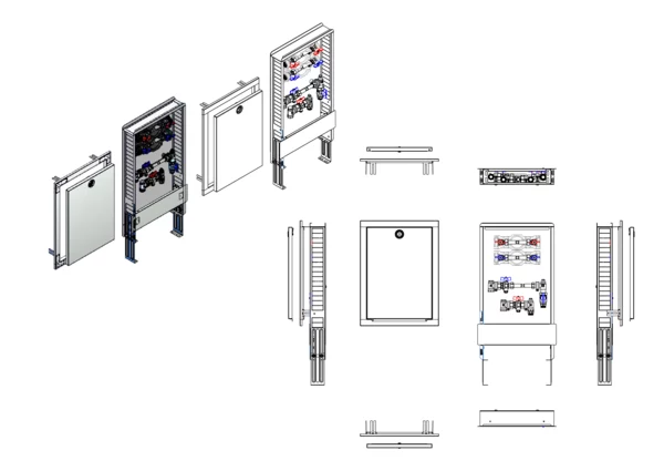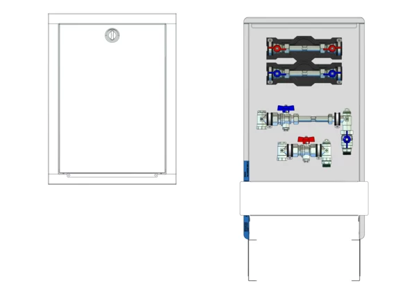 Die Wohnungsanschlussstation ist mit einer Wärmezählervorbereitung und Wasserzählerverrohrungen für Trinkwasser kalt und warm, sowie einem vertikalen Primär- und Sekundäranschluss im Unterputzschrank ausgestattet.
