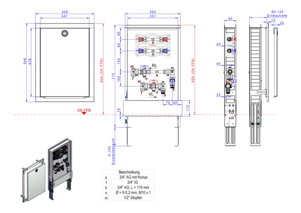 Die Anschlussstation ist für Wohnungsanschlüsse geeignet. Sie dient zum Absperren und zur Wärmezählung des Wohnungsstranges. Im Standard-Unterputzschrank mit Frontblende in weiß RAL 9016 mit einer Einbautiefe von 80 bis 120 mm ist eine Edelstahlverrohrung mit einer vertikalen Anschlussgarnitur mit Wärmezählervorbereitung 3/4" Länge 110 mm und Fühleranschluss 5-5,2 M10x1 im Vor- und Rücklaufkugelhahn ist schallentkoppelt montiert. Die Sekundärabgänge sind ebenfalls vertikal ausgerichtet. In der Anschlussstation ist zusätzlich eine Wasserzählervorbereitung 3/4" AG Länge 110 mm mit Absperrungen für kaltes und warmes Trinkwasser montiert.