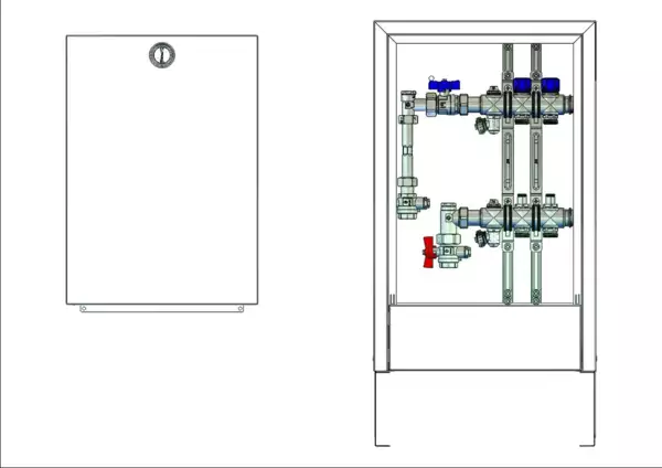 strawa FB-Anschlussstation H 53-WMZ-AP 2 Hkr.,BxHxT: 392x620x125 mm, vert. AG m. WMZ, Verteiler mit Regulierventil + THV M30x1,5, Standard-AP-Schrank in RAL 9016