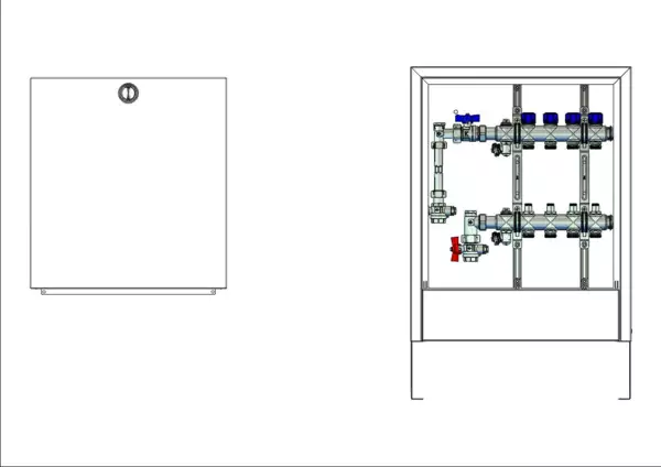 Die Anschlussstation für Flächenheizung und -kühlung ist im Aufputzschrank montiert und umfasst einen Edelstahlverteiler mit integrierten Regulierventilen und Ventileinsätzen (M30x1,5), sowie eine vertikale Anschlussgarnitur mit Wärmezählerverrohrung. Es gibt Platzhaltungen für eine Klemmleiste und Stellantriebe.