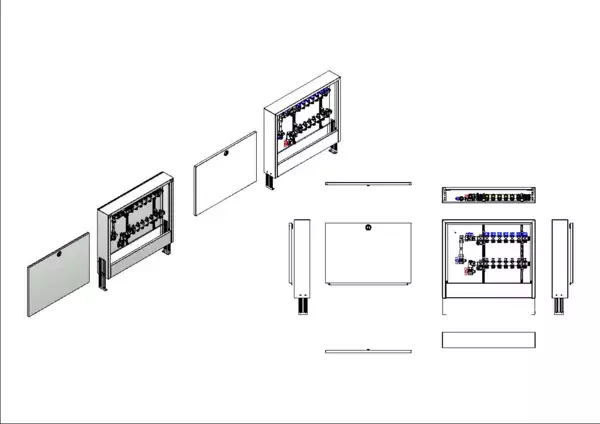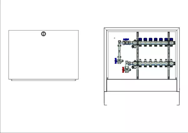 strawa FB-Anschlussstation H 53-WMZ-AP 7 Hkr.,BxHxT: 732x620x125 mm, vert. AG m. WMZ, Verteiler mit Regulierventil + THV M30x1,5, Standard-AP-Schrank in RAL 9016