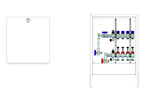 strawa FB-Anschlussstation H 63-WMZ-AP 4 Hkr.,BxHxT: 496x620x125 mm, vert. AG. m. WMZ, Verteiler mit DFA 0-3 l/min + THV M30x1,5, Standard-AP-Schrank in RAL 9016