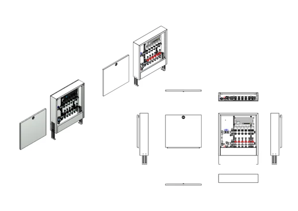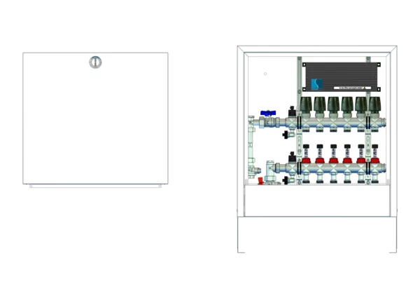 strawa FB-Anschlussstation H 63-WMZ-AP-X 6 Hkr.,BxHxT: 582x620x125 mm, vert. AG. m. WMZ, Verteiler mit DFA 0-3 l/min + THV M30x1,5, vorm. Stellantr. + Klemml. m. Vorverdraht., Standard-AP-Schrank in RAL 9016
