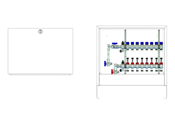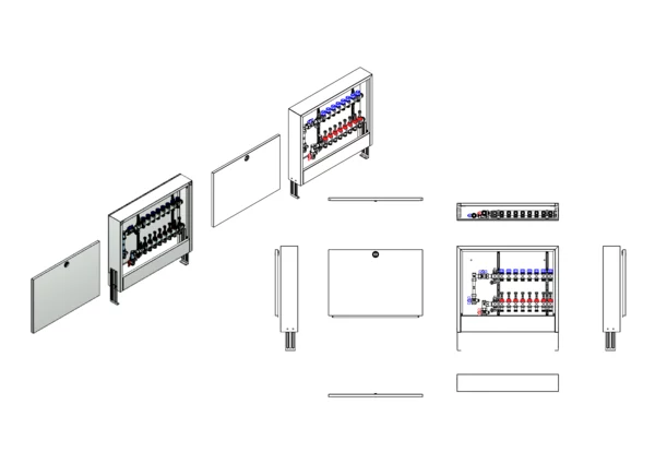 Die Anschlussstation für Flächenheizung und -kühlung ist im Aufputzschrank montiert und umfasst einen Edelstahlverteiler mit regulierbaren Durchflussanzeigern und Ventileinsätzen (M30x1,5), sowie eine vertikale Anschlussgarnitur mit Wärmezählerverrohrung. Es gibt Platzhaltungen für eine Klemmleiste und Stellantriebe.