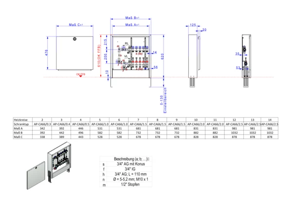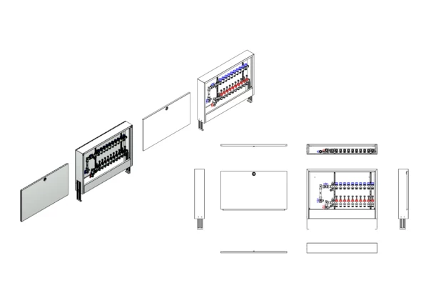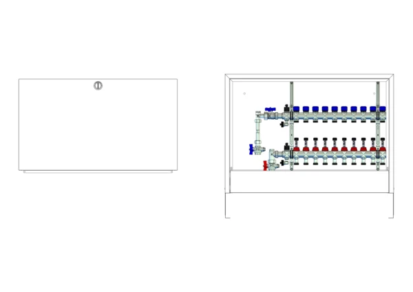 Die Anschlussstation für Flächenheizung und -kühlung ist im Aufputzschrank montiert und umfasst einen Edelstahlverteiler mit regulierbaren Durchflussanzeigern und Ventileinsätzen (M30x1,5), sowie eine vertikale Anschlussgarnitur mit Wärmezählerverrohrung. Es gibt Platzhaltungen für eine Klemmleiste und Stellantriebe.
