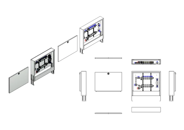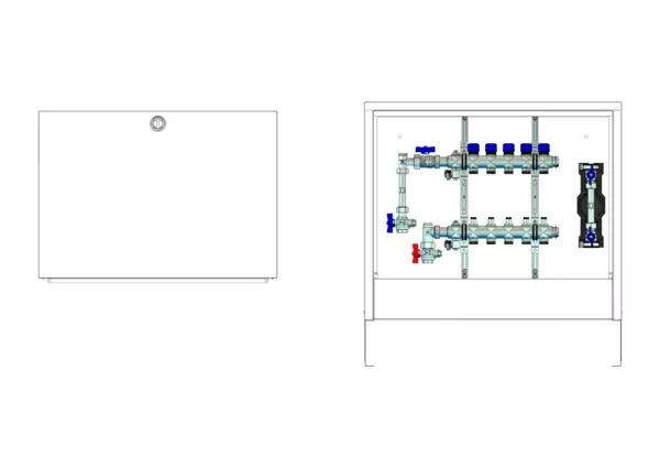strawa FB-Anschlussstation H 53-W1-WMZ-AP 5 Hkr.,BxHxT: 732x620x125 mm, vert. AG m. WMZ, Verteiler mit Regulierventil + THV M30x1,5, Wasserzählerstr. TW kalt, Standard-AP-Schrank in RAL 9016