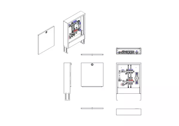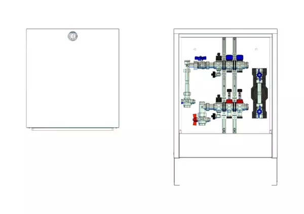 strawa FB-Anschlussstation H 63-W1-WMZ-AP 2 Hkr.,BxHxT: 496x620x125 mm, vert. AG. m. WMZ, Verteiler mit DFA 0-3 l/min + THV M30x1,5, Wasserzählerstr. TW kalt, Standard-AP-Schrank in RAL 9016