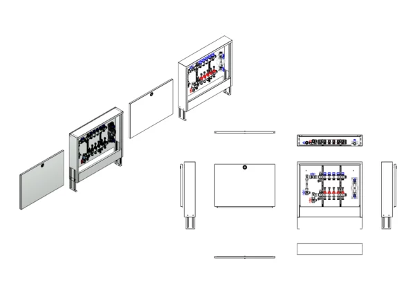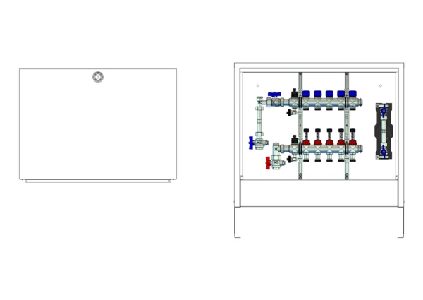 Die Anschlussstation für Flächenheizung und -kühlung ist im Aufputzschrank montiert und umfasst einen Edelstahlverteiler mit regulierbaren Durchflussanzeigern und Ventileinsätzen (M30x1,5), sowie eine vertikale Anschlussgarnitur mit Wärmezählerverrohrung. Zusätzlich ist eine Wasserzählereinbaustrecke für Trinkwasser kalt vorhanden. Die vormontierten und verdrahteten Stellantriebe sind auf einer montierten Klemmleiste installiert.