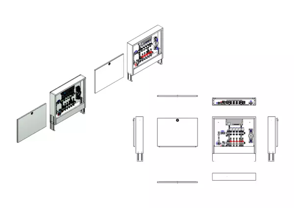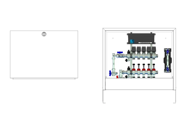 Die Anschlussstation für Flächenheizung ist im Aufputzschrank montiert und umfasst einen Edelstahlverteiler mit regulierbaren Durchflussanzeigern und Ventileinsätzen (M30x1,5), sowie eine vertikale Anschlussgarnitur mit Wärmezählerverrohrung. Zusätzlich ist eine Wasserzählereinbaustrecke für Trinkwasser kalt vorhanden. Die vormontierten und verdrahteten Stellantriebe sind auf einer montierten Klemmleiste installiert.