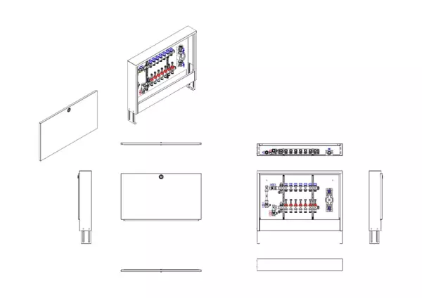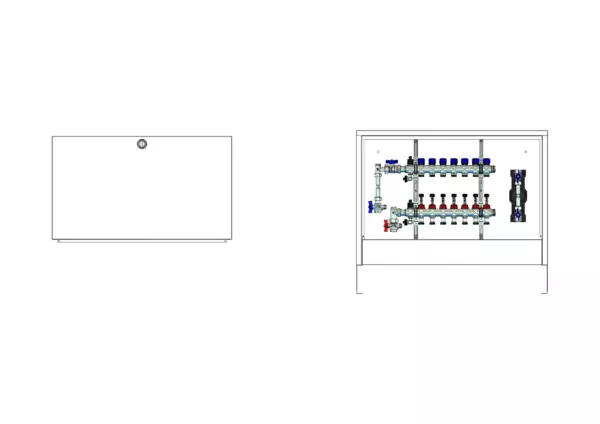Die Anschlussstation für Flächenheizung und -kühlung ist im Aufputzschrank montiert und umfasst einen Edelstahlverteiler mit regulierbaren Durchflussanzeigern und Ventileinsätzen (M30x1,5), sowie eine vertikale Anschlussgarnitur mit Wärmezählerverrohrung. Zusätzlich ist eine Wasserzählereinbaustrecke für Trinkwasser kalt vorhanden. Die vormontierten und verdrahteten Stellantriebe sind auf einer montierten Klemmleiste installiert.