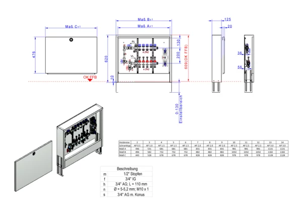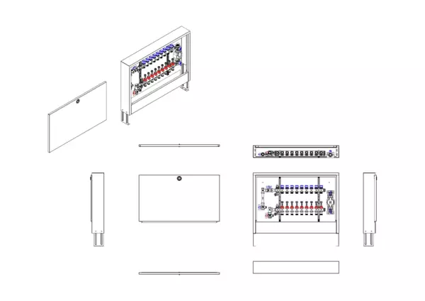 Die Anschlussstation für Flächenheizung und -kühlung ist im Aufputzschrank montiert und umfasst einen Edelstahlverteiler mit regulierbaren Durchflussanzeigern und Ventileinsätzen (M30x1,5), sowie eine vertikale Anschlussgarnitur mit Wärmezählerverrohrung. Zusätzlich ist eine Wasserzählereinbaustrecke für Trinkwasser kalt vorhanden. Die vormontierten und verdrahteten Stellantriebe sind auf einer montierten Klemmleiste installiert.