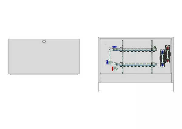 vertikale Anschlussgarnitur mit Wärmezählerverrohrung, Verteiler ohne Einbauten, Wasserzählerstrecken Trinkwasser kalt und warm, Standard-Aufputz-Schrank in RAL 9016