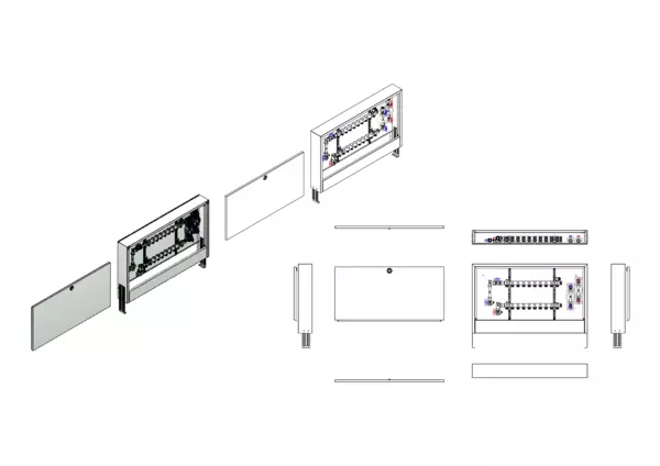 Die Anschlussstation für Heizkörperanbindungen ist im Aufputzschrank montiert und umfasst einen Edelstahlverteiler ohne zusätzliche Einbauten im Heizkreis, sowie eine vertikale Anschlussgarnitur mit Wärmezählerverrohrung. Zusätzlich sind Wasserzählereinbaustrecken für Trinkwasser kalt und warm vorhanden.
