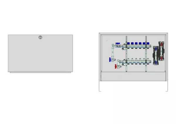 strawa FB-Anschlussstation H 53-W2-WMZ-AP 6 Hkr.,BxHxT: 882x620x125 mm, vert. AG m. WMZ, Verteiler mit Regulierventil + THV M30x1,5, Wasserzählerstr. TW kalt u. warm, Standard-AP-Schrank in RAL 9016