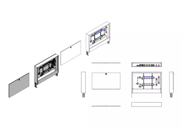 Die Anschlussstation für Flächenheizung und -kühlung ist im Aufputz-Schrank montiert und umfasst einen Edelstahlverteiler mit integrierten Regulierventilen und Ventileinsätzen (M30×1,5) sowie eine vertikale Anschlussgarnitur mit Wärmezählerverrohrung. Zusätzlich sind Wasserzählereinbaustrecken für Trinkwasser kalt und warm vorhanden. Es gibt Platzhaltungen für eine Klemmleiste und Stellantriebe.