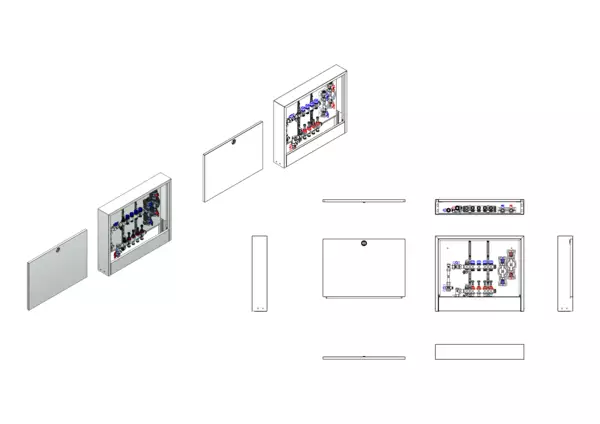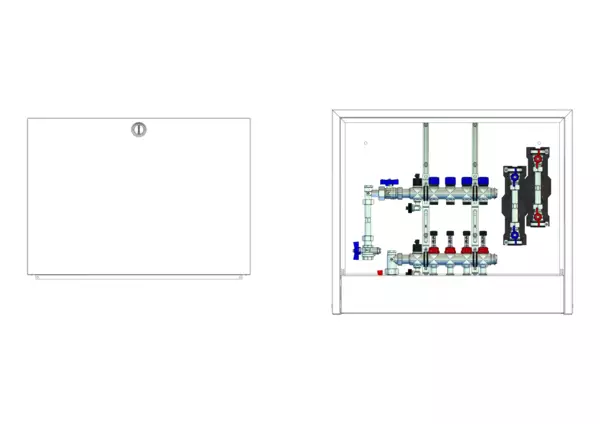 strawa FB-Anschlussstation H 63-W2-WMZ-AP 4 Hkr.,BxHxT: 732x620x125 mm, vert. AG. m. WMZ, Verteiler mit DFA 0-3 l/min + THV M30x1,5, Wasserzählerstr. TW kalt u. warm, Standard-AP-Schrank in RAL 9016