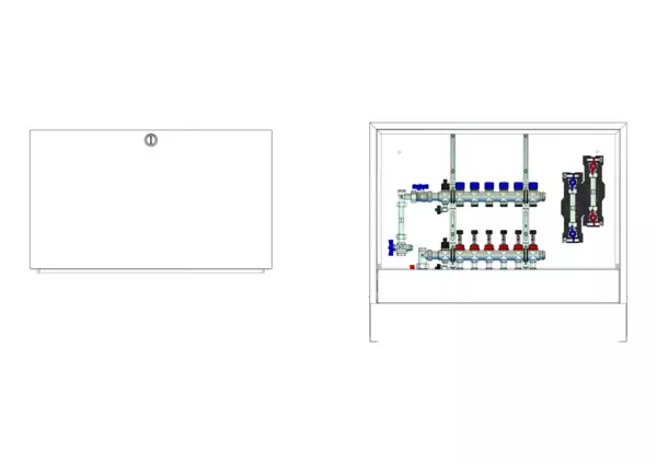 strawa FB-Anschlussstation H 63-W2-WMZ-AP 6 Hkr.,BxHxT: 882x620x125 mm, vert. AG. m. WMZ, Verteiler mit DFA 0-3 l/min + THV M30x1,5, Wasserzählerstr. TW kalt u. warm, Standard-AP-Schrank in RAL 9016
