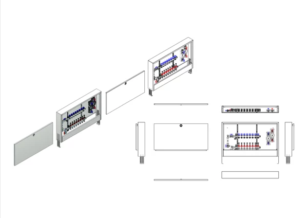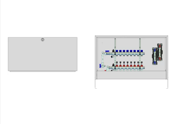 strawa FB-Anschlussstation H 63-W2-WMZ-AP 8 Hkr.,BxHxT: 1032x620x125 mm, vert. AG. m. WMZ, Verteiler mit DFA 0-3 l/min + THV M30x1,5, Wasserzählerstr. TW kalt u. warm, Standard-AP-Schrank in RAL 9016