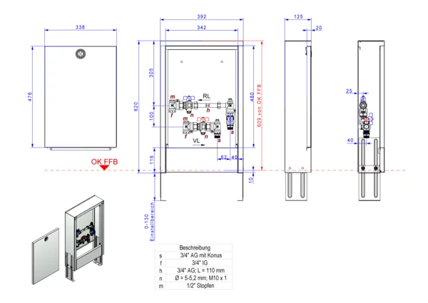 Die Anschlussstation ist für Wohnungsanschlüsse geeignet. Sie dient zum Absperren und zur Wärmezählung des Wohnungsstranges. Im Standard-Aufputzschrank komplett in weiß RAL 9016 mit einer Bautiefe von 125 mm ist eine Edelstahlverrohrung mit einer vertikalen Anschlussgarnitur mit Wärmezählervorbereitung 3/4" Länge 110 mm und Fühleranschluss 5-5,2 M10x1 im Vor- und Rücklaufkugelhahn ist schallentkoppelt montiert. Die Sekundärabgänge sind ebenfalls vertikal ausgerichtet.