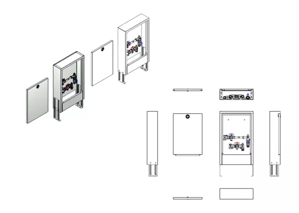 1. ohnungsanschluss, vertikale Anschlussgarnitur mit Wärmezählerverrohrung, Standard-Aufputz-Schrank in RAL 9016