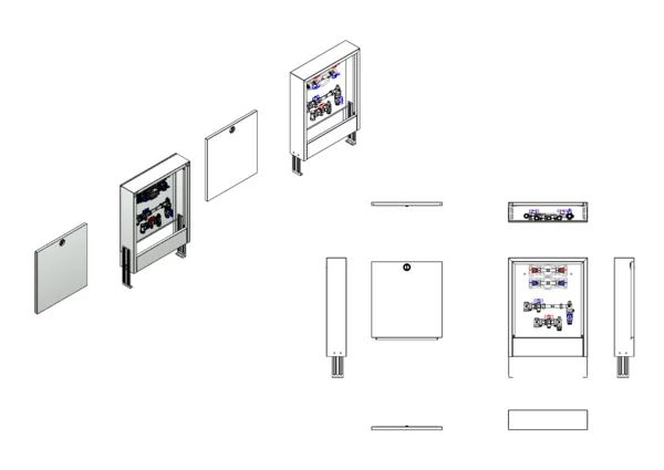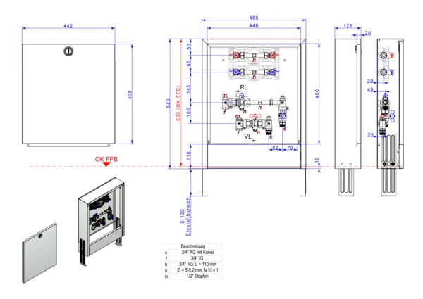 Die Anschlussstation ist für Wohnungsanschlüsse geeignet. Sie dient zum Absperren und zur Wärmezählung des Wohnungsstranges. Im Standard-Aufputzschrank komplett in weiß RAL 9016 mit einer Bautiefe von 125 mm ist eine Edelstahlverrohrung mit einer vertikalen Anschlussgarnitur mit Wärmezählervorbereitung 3/4" Länge 110 mm und Fühleranschluss 5-5,2 M10x1 im Vor- und Rücklaufkugelhahn ist schallentkoppelt montiert. Die Sekundärabgänge sind ebenfalls vertikal ausgerichtet. In der Anschlussstation ist zusätzlich eine Wasserzählervorbereitung 3/4" AG Länge 110 mm mit Absperrungen für kaltes und warmes Trinkwasser montiert.