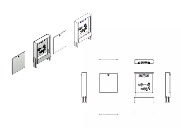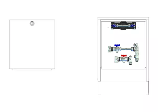 Die Wohnungsanschlussstation ist mit einer Wärmezählervorbereitung, einem Regulierventil für den hydraulischen Abgleich und einer Wasserzählerverrohrung für Trinkwasser kalt, sowie einem vertikalen Primär- und Sekundäranschluss im Aufputzschrank ausgestattet.