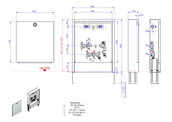 Die Anschlussstation ist für Wohnungsanschlüsse geeignet. Sie dient zum Absperren und zur Wärmezählung des Wohnungsstranges. Im Standard-Aufputzschrank komplett in weiß RAL 9016 mit einer Bautiefe von 125 mm ist eine Edelstahlverrohrung mit einer vertikalen Anschlussgarnitur mit Wärmezählervorbereitung 3/4" Länge 110 mm und Fühleranschluss 5-5,2 M10x1 im Vor- und Rücklaufkugelhahn und Regulierventil im Rücklauf ist schallentkoppelt montiert. Die Sekundärabgänge sind ebenfalls vertikal ausgerichtet. In der Anschlussstation ist zusätzlich eine Wasserzählervorbereitung 3/4" AG Länge 110 mm mit Absperrungen für kaltes Trinkwasser montiert.