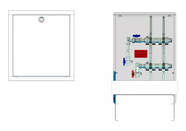 vertikale Anschlussgarnitur mit Wärmezählerverrohrung, Verteiler ohne Einbauten, Standard-Unterputz-Schrank mit Frontblende in RAL 9016